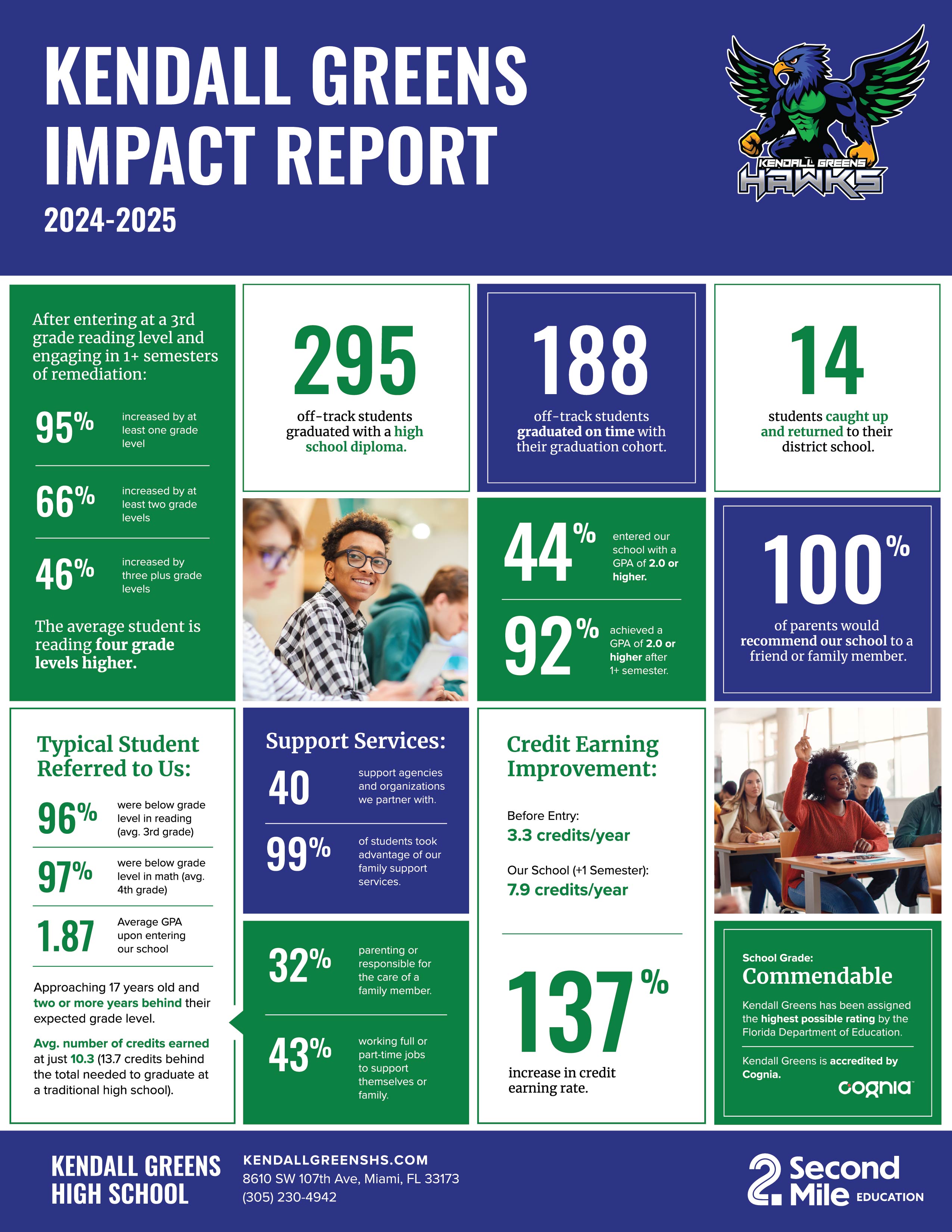 Kendall Greens has been assigned a SIR Rating of "Commendable." See our historical SIR rating history below. Read more about Florida School Accountability at the Florida Department of Education Website. Accountability Data and link: KENDALL GREENS HIGH SCHOOL REPORT CARD Student Success: We invite you to review our Student Success Stories to hear about our these experiences directly from the source - our students themselves! Each of these students individual success helps make up some pretty remarkable results.
